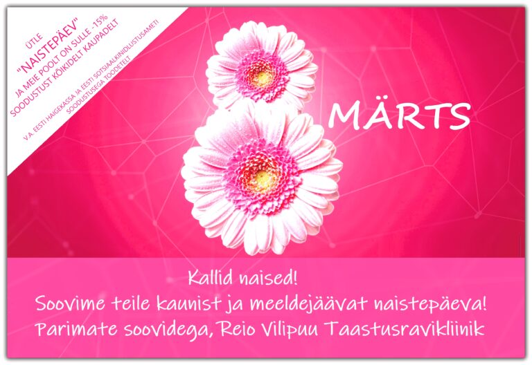 Ilusat emadepäeva kõigile emadele! 08.05-15.05 on Reio Vilipuu Taastusravikliinikus (Kotka 12) ning ka epoes www.taastusravikliinik.ee koodiga “ema2020” kõik kaubad -20%. Oleme avatud tavapärastel kellaaegadel. Säilitame endised ohutusreeglid – töötajatel on töös patsientidega maskid ja kõik vajalikud vahendid käte ja pindade…